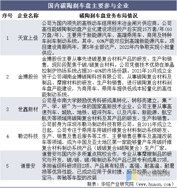 Limited by many barriers such as complex technology, difficult production and long production cycle, there are few domestic enterprises capable of mass production of carbon ceramic disc. At present, the main domestic enterprises involved in the research and development of carbon ceramic brake disc are Tianyi Shangjia, Jinbo Shares, Shixin New Materials, Lemai Technology and Dao Pu 'an, etc.