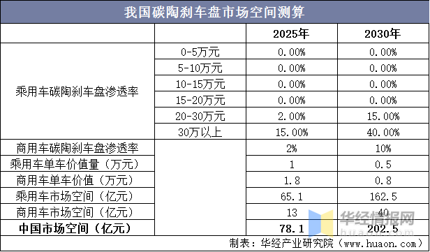 At present, the application scope of carbon ceramic brake disc is small. It is estimated that the domestic market is expected to reach 7.81 billion yuan in 2025, and the domestic market scale is expected to exceed 20 billion yuan in 2030. With the acceleration of the electrification process and the consideration of automobile safety, once the breakthrough will become the selling point of automobile safety, the permeability increase speed of carbon ceramic brake disc will likely greatly exceed the expectation.
